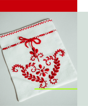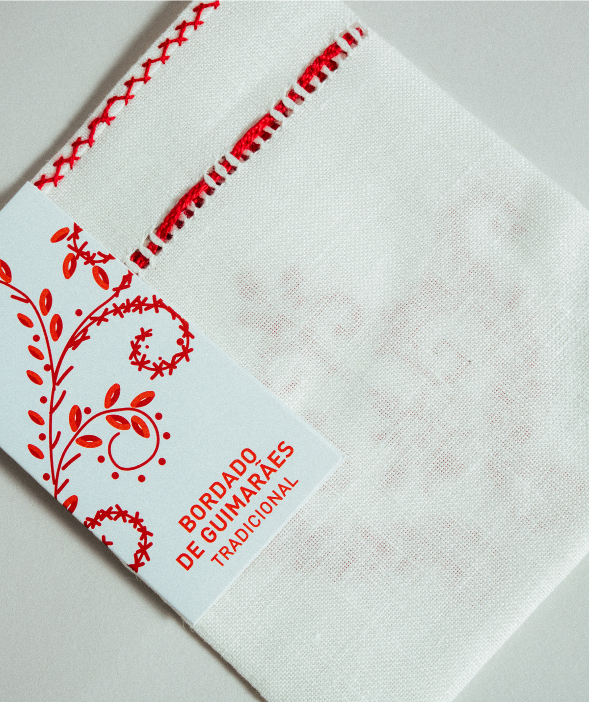 The embroidery is a mix of rich 19th-century embroidery and even older popular embroidery, all originating from the city of Guimarães (Minho, Portugal). It allows only six colours (red, blue, beige, grey, white, and black) which must be stitched individually, reproducing stylized motifs.