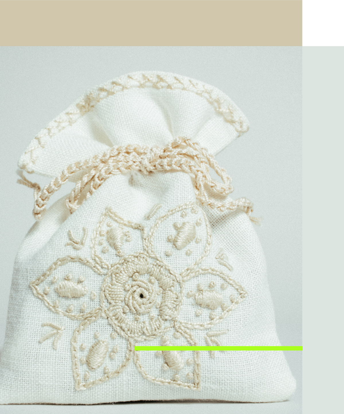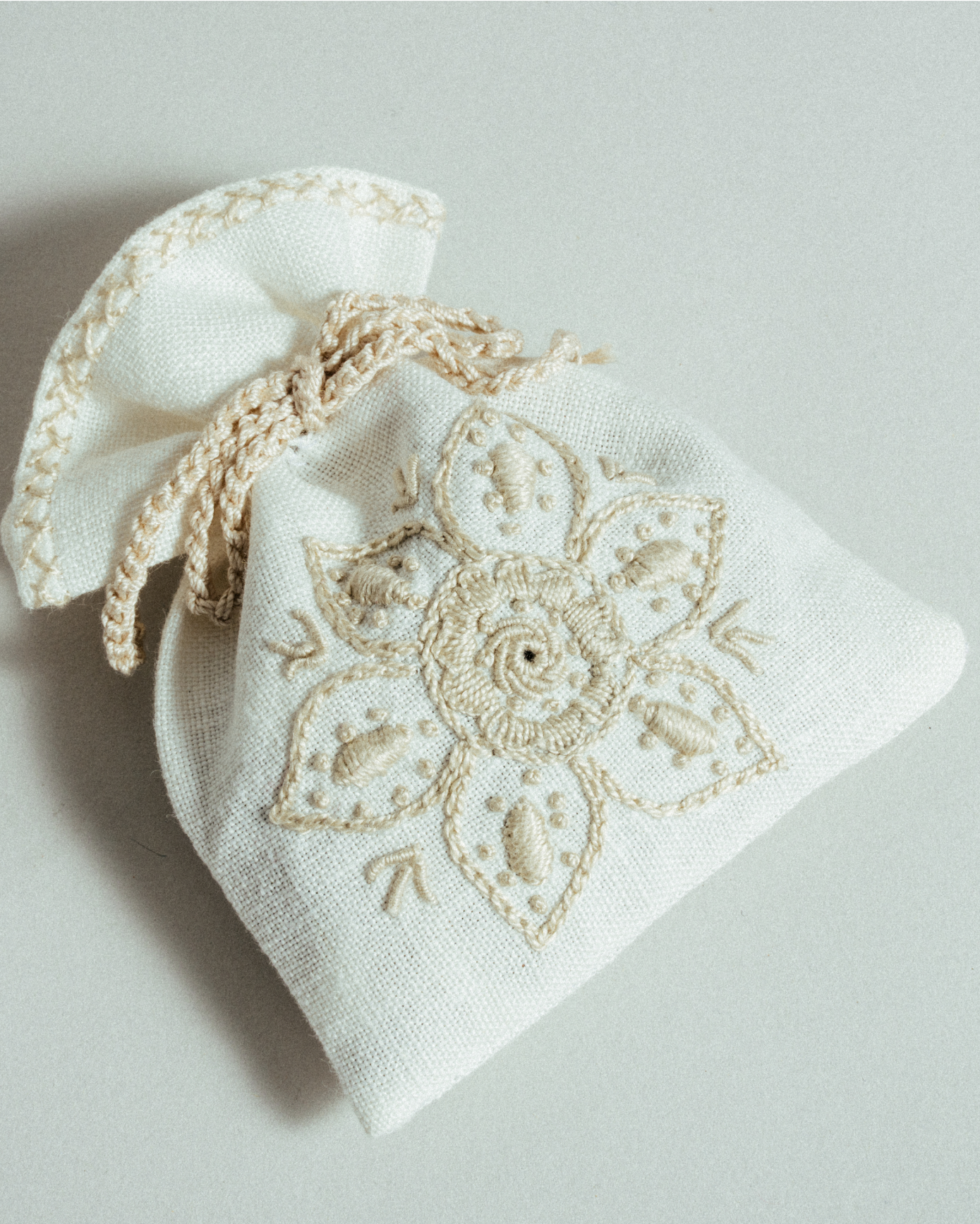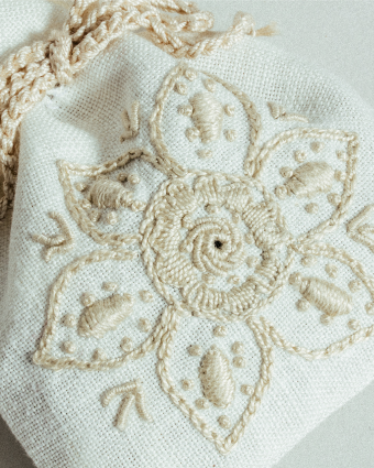 Feito em tecido de linho, o Saco de Alfazema é das poucas peças que encontrámos decoradas com esta técnica histórica de bordado artesanal, vibrante pelas cores, textura e padrão de qualidade ímpar. É uma obra de arte invulgar, escondida à vista de todos.